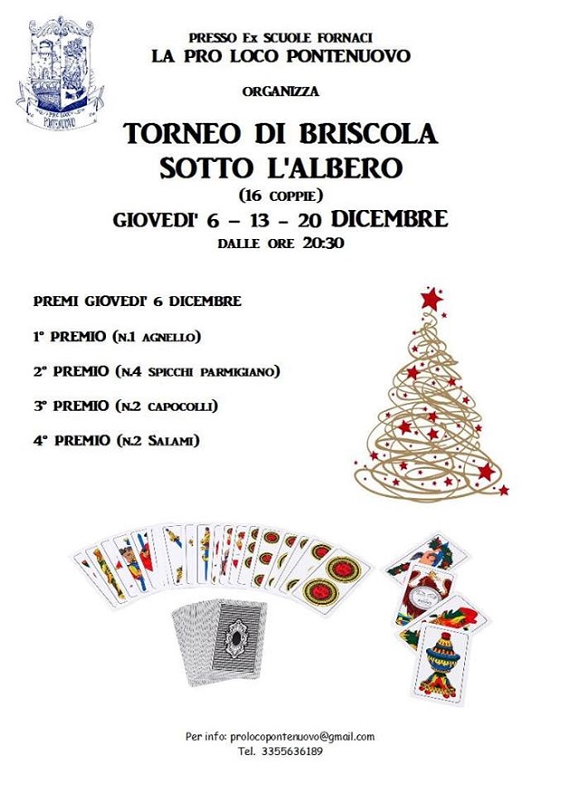 La Proloco Pontenuovo organizza:"Torneo di Briscola sotto l'Albero", presso ex scuole Fornaci, il 6 e il 20 dicembre 2018 per riprendere il 6 gennaio 2019.Info: prolocopontenuovo@gmail.com - 3355636189