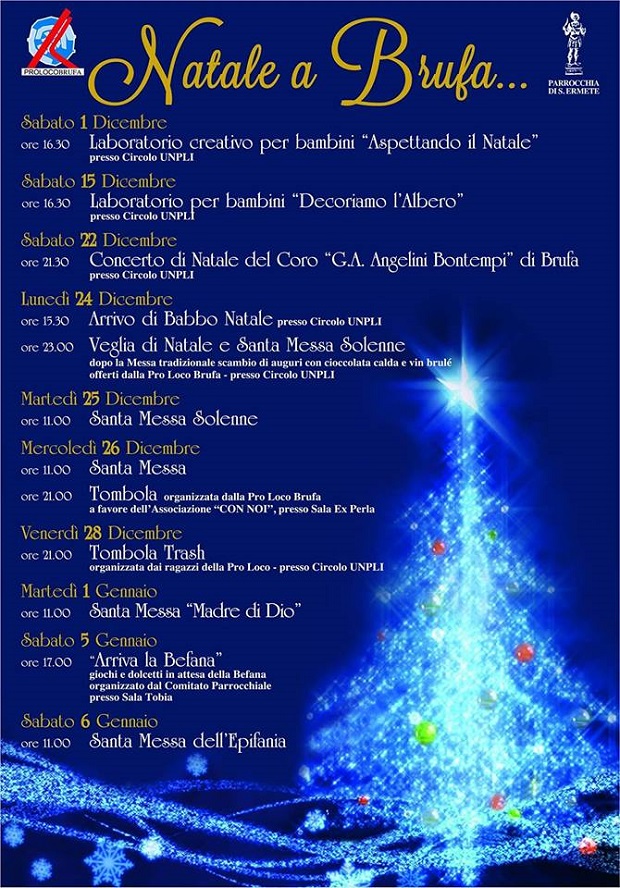 Natale a Brufa!Ecco il programma di tutti gli eventi durante tutte le festività Natalizie dal 1 dicembre 2018 al 6 gennaio 2019.A cura della Proloco di Brufa.